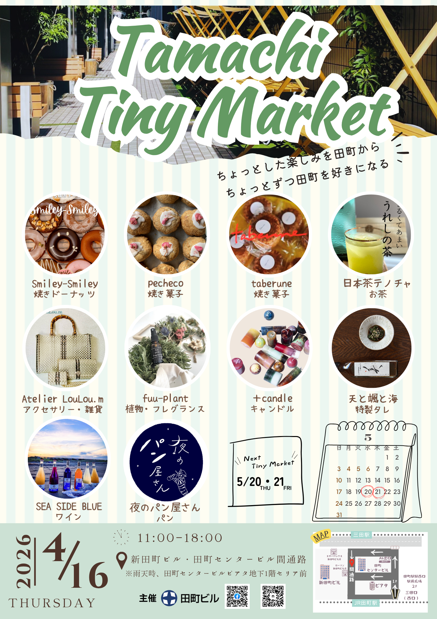 ふらっと立ち寄れる小さなマーケットが田町センタービルと新田町ビルの間通路で開催されます。